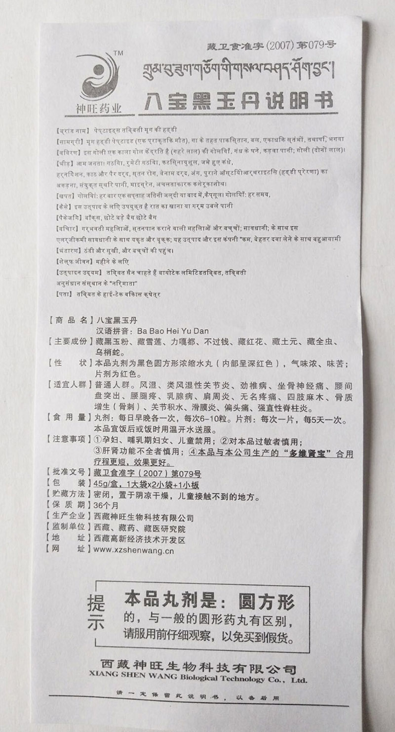 八宝黑玉丹是由西藏神旺生物科技有限公司生产,公司成立于2006年,是一家国有企业,隶属于国资委。主要搜集、研究流传于各个寺庙中和藏民间的秘方,验方,试验各种天然藏药的药理特性,验证其确切的疗效。公司的产品的主要优势体现在①讲究去毒②讲究提炼③组方独特④独特的合成方法⑤入药原料广泛,承接全国的市场业务。