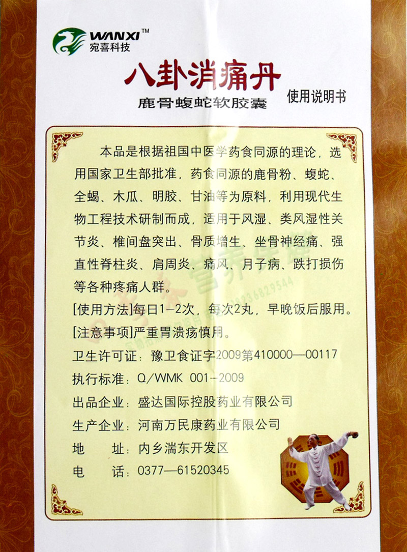 八卦消痛丹由厂家河南万民康药业有限公司采用药食同源的鹿骨粉、蝮蛇、全蝎、木瓜、明胶、甘油等多种天然名贵中草药材炼制而成。八卦消痛丹鹿骨腹蛇软胶囊对风湿骨病等人群具有良好的康复保健作用。八卦消痛丹秘方源自千年医学珍藏,经科学配比,运用现代生物技术精制而成,具有祛风止痛、除湿散寒、舒筋活络、活血化淤、强筋壮骨的神奇功效。告别风湿骨病烦恼,八卦消痛丹鹿骨腹蛇软胶囊为您的骨质健康保驾护航!