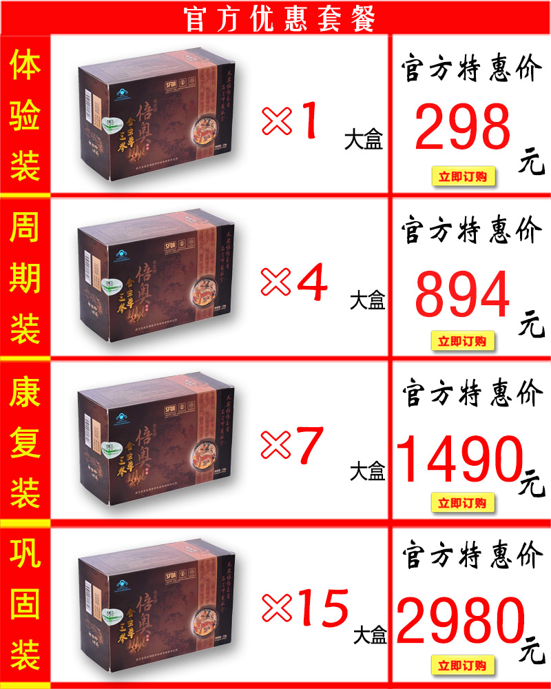 《皇帝内经》云:气血充盈则百病不生,金虫草三参软胶囊内含的冬虫夏草、西洋参、人参、党参等名贵中药材,具有滋补肾阳,能够调补人气的气血,使气血充盈,提高人体自身的抵抗力,恢复的生精和代谢机能,使代谢出的各种垃圾等能够及时彻底的排出,使用5-7天,你会发现排尿通畅了,以前的尿频、尿急、尿痛、排尿困难等现象彻底不见了,而且气色开始好转,精神头也足了。